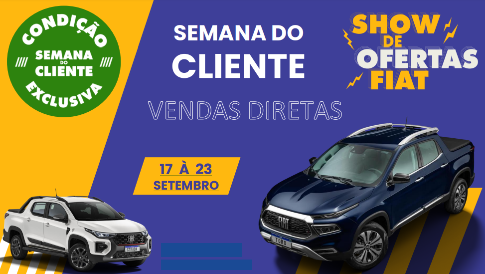 Com a condição exclusiva semana do cliente, estamos oferecendo promoções e benefícios que farão você se apaixonar ainda mais pela nossa linha de veículos. São descontos imperdíveis, condições de financiamento facilitadas e muito mais! Não importa se você precisa de um carro para a cidade ou para o campo, a Fiat garante soluções para todas as suas necessidades.